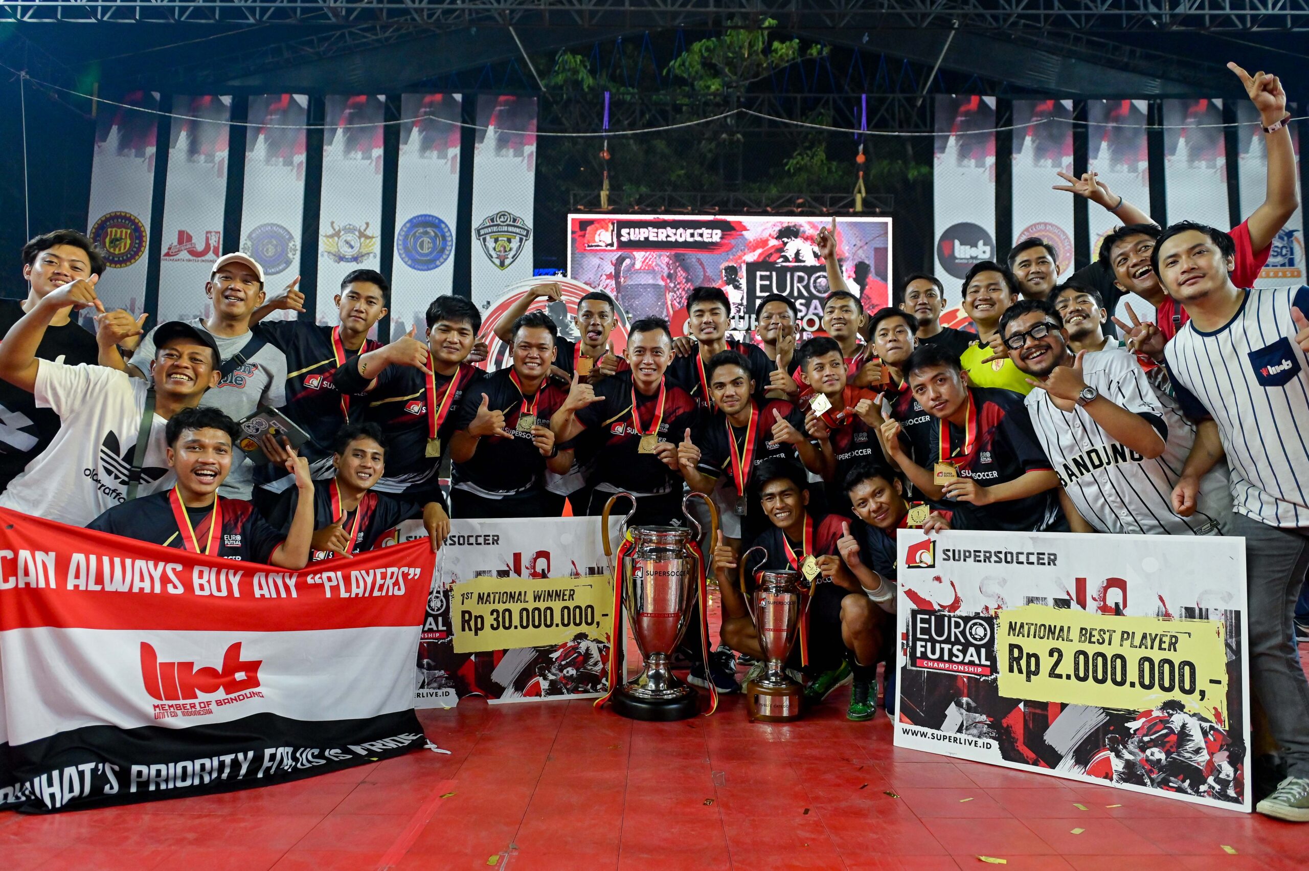 MOB Kahiji!!! Teriak Supporter langsung pecah waktu United Indonesia Member of Bandung (MOB) mastiin diri sebagai Pemenang Supersoccer Euro Futsal Championship kategori fans club tahun 2023.