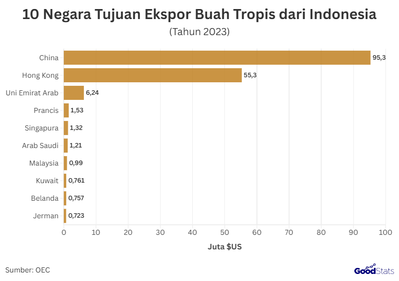Data dari Observatory of Economic Complexity (OEC) mencatat pada 2023, China menjadi negara tujuan Esensial ekspor buah tropis dari Indonesia dengan nilai mencapai US$95,3 juta, diikuti oleh Hong Kong dengan US$55,3 juta. Sementara itu, Uni Emirat Arab berada di urutan ketiga dengan nilai ekspor sebesar US$6,24 juta, disusul oleh Prancis dengan US$1,53 juta. Prancis mengisi posisi keempat dengan US$1,53 juta.