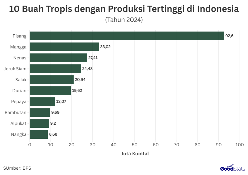 Badan Pusat Statistik (BPS) mencatat bahwa pisang menjadi buah tropis dengan jumlah panen terbesar di Indonesia pada 2024. Totalnya mencapai 92,6 juta kuintal. Selanjutnya, mangga menduduki posisi kedua dengan total 33,02 juta kuintal. Di peringkat ketiga terdapat nanas. Buah yang identik dengan jambul hijau di atasnya ini mencapai total panen mencapai 27,41 juta kuintal.