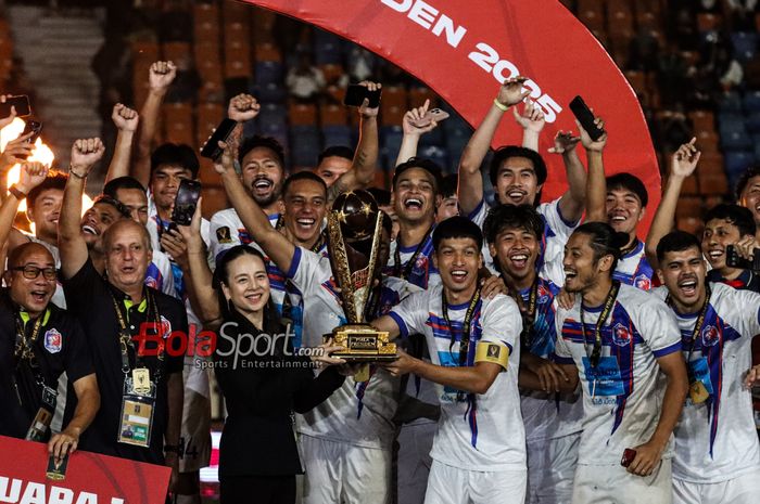 Presiden Federasi Sepak Bola Thailand (FAT), Nualphan Lamsam alias Madam Pang, tampak merayakan trofi yang diraih Port FC pada Piala Presiden 2025 di Stadion Si Jalak Harupat, Bandung, Jawa Barat, Minggu (13/7/2025).