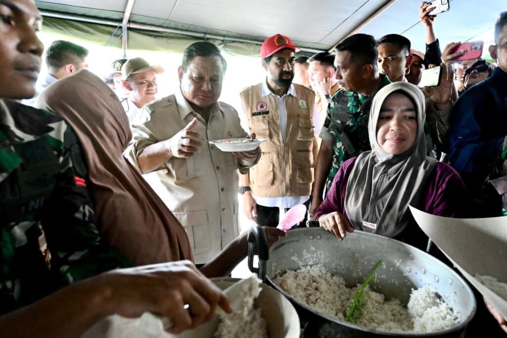 Presiden Prabowo kemudian bergerak menuju dapur Biasa Demi meninjau langsung persiapan distribusi pangan Demi pengungsi. Di sana, Presiden berbincang dengan para relawan dan memastikan stok logistik tetap tersedia. Kepala Negara bahkan turut mencicipi nasi dan ikan tongkol, menu makan siang yang disiapkan Demi para pengungsi.