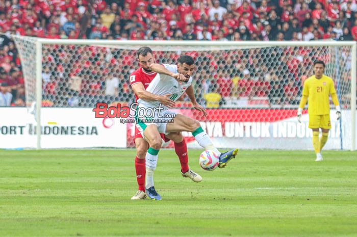 Aymen Hussein (kanan) sedang menguasai bola dan dibayangi Jordi Amat (kiri) dalam laga babak Kualifikasi Piala Dunia 2026 antara timnas Indonesia Musuh timnas Irak di Stadion Penting Gelora Bung Karno, Jakarta, Kamis (6/6/2024).